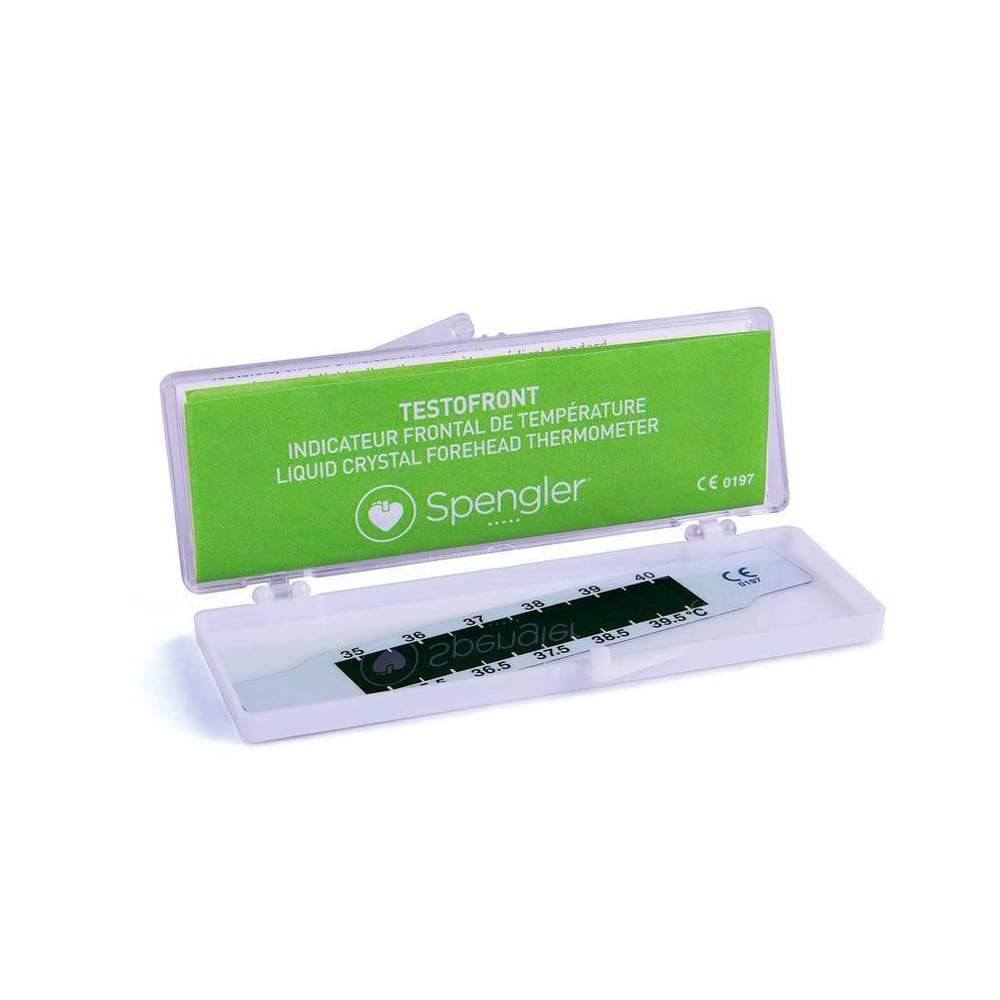 Le thermomètre frontal Testofront à cristaux liquides est l’outil pratique pour vérifier la température. Les cristaux liquides réagissent à la chaleur et révèlent une couleur en fonction de la température frontale de la personne.